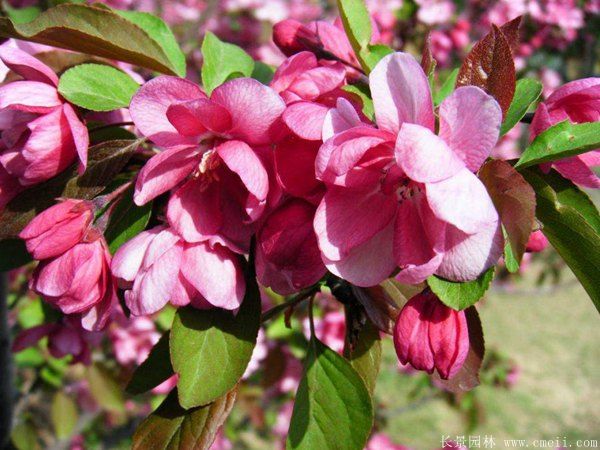 海棠,樹體總高0.4~2米高左右,葉子開花的形態根據品種有差異有差別,有的較為細長,有的比較圓,海棠花色調是豐富,如淺紅,粉色,深黃色,粉白色等,花開的時間較長,開花量大,每年是花開的時間期間從6月上旬到8月中旬,種子9~10月才熟,有較高的出苗水平。